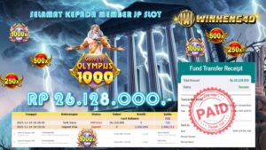 Selamat kepada User ID : EW***PO555 Telah berhasil mendapatkan kemenangan besar pada Permainan JP SLOT GATES OF OLYMPUS 1000 Dengan kemenangan Sebesar Rp 26.128.000,- Setelah mengisi formulir withdraw dengan kurung waktu hanya 5-10 menit pihak WINHENG4D sudah melakukan transfer kepada pemilik User ID dan dana sudah dapat di cairkan oleh pemenang. Bukti pembayaran yang kami berikan merupakan bukti pembayaran yang SAH / VALID yang langung di dapatkan melaui tanda transfer transaksi dari Bank yang di tuju.