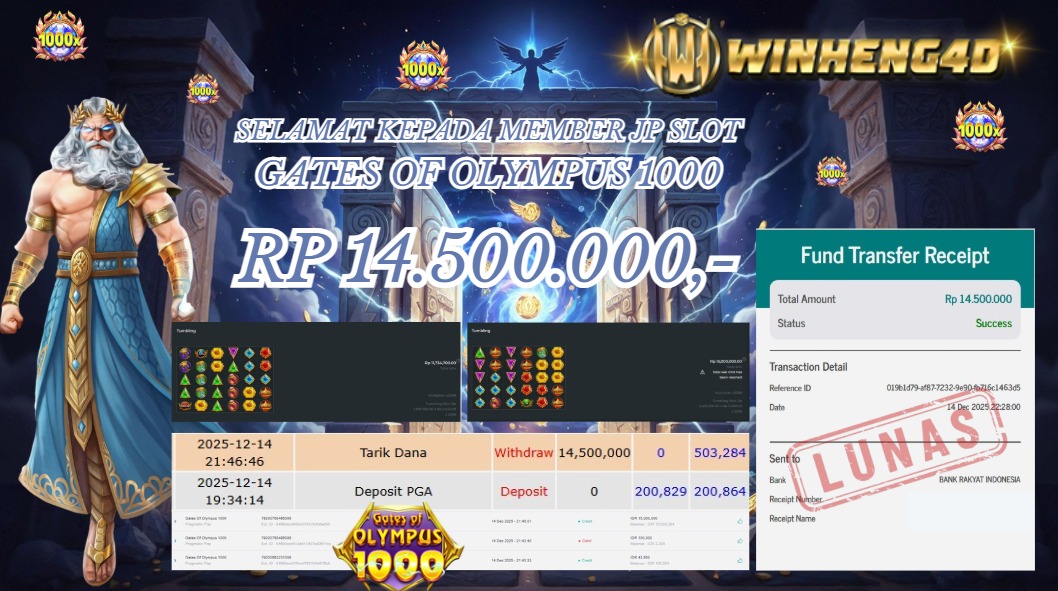Selamat kepada User ID : XAE***FU3Telah berhasil mendapatkan kemenangan besar pada Permainan JP SLOT GATES OF OLYMPUS 1000 Dengan kemenangan Sebesar Rp 14.500.000,- Setelah mengisi formulir withdraw dengan kurung waktu hanya 5-10 menit pihak WINHENG4D sudah melakukan transfer kepada pemilik User ID dan dana sudah dapat di cairkan oleh pemenang. Bukti pembayaran yang kami berikan merupakan bukti pembayaran yang SAH / VALID yang langung di dapatkan melaui tanda transfer transaksi dari Bank yang di tuju.