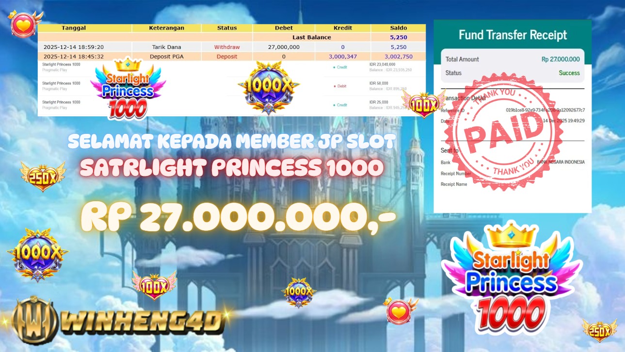Selamat kepada User ID : HAE***IN Telah berhasil mendapatkan kemenangan besar pada Permainan JP SLOT STARLIGHT PRINCESS 1000 Dengan kemenangan Sebesar Rp 27.000.000,- Setelah mengisi formulir withdraw dengan kurung waktu hanya 5-10 menit pihak WINHENG4D sudah melakukan transfer kepada pemilik User ID dan dana sudah dapat di cairkan oleh pemenang. Bukti pembayaran yang kami berikan merupakan bukti pembayaran yang SAH / VALID yang langung di dapatkan melaui tanda transfer transaksi dari Bank yang di tuju.