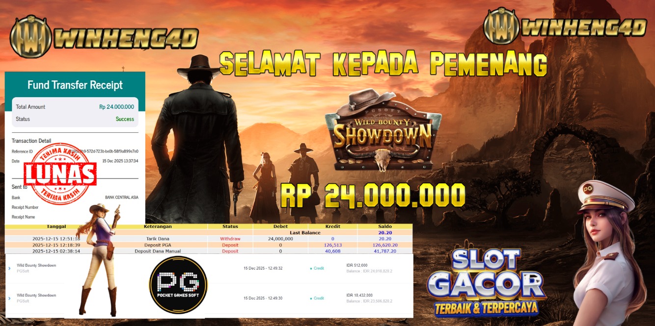 Selamat kepada User ID : RODR***11 Telah berhasil mendapatkan kemenangan besar pada Permainan JP SLOT WILD BOUNTY SHOWDOWN Dengan kemenangan Sebesar Rp 24.000.000,- Setelah mengisi formulir withdraw dengan kurung waktu hanya 5-10 menit pihak WINHENG4D sudah melakukan transfer kepada pemilik User ID dan dana sudah dapat di cairkan oleh pemenang. Bukti pembayaran yang kami berikan merupakan bukti pembayaran yang SAH / VALID yang langung di dapatkan melaui tanda transfer transaksi dari Bank yang di tuju.