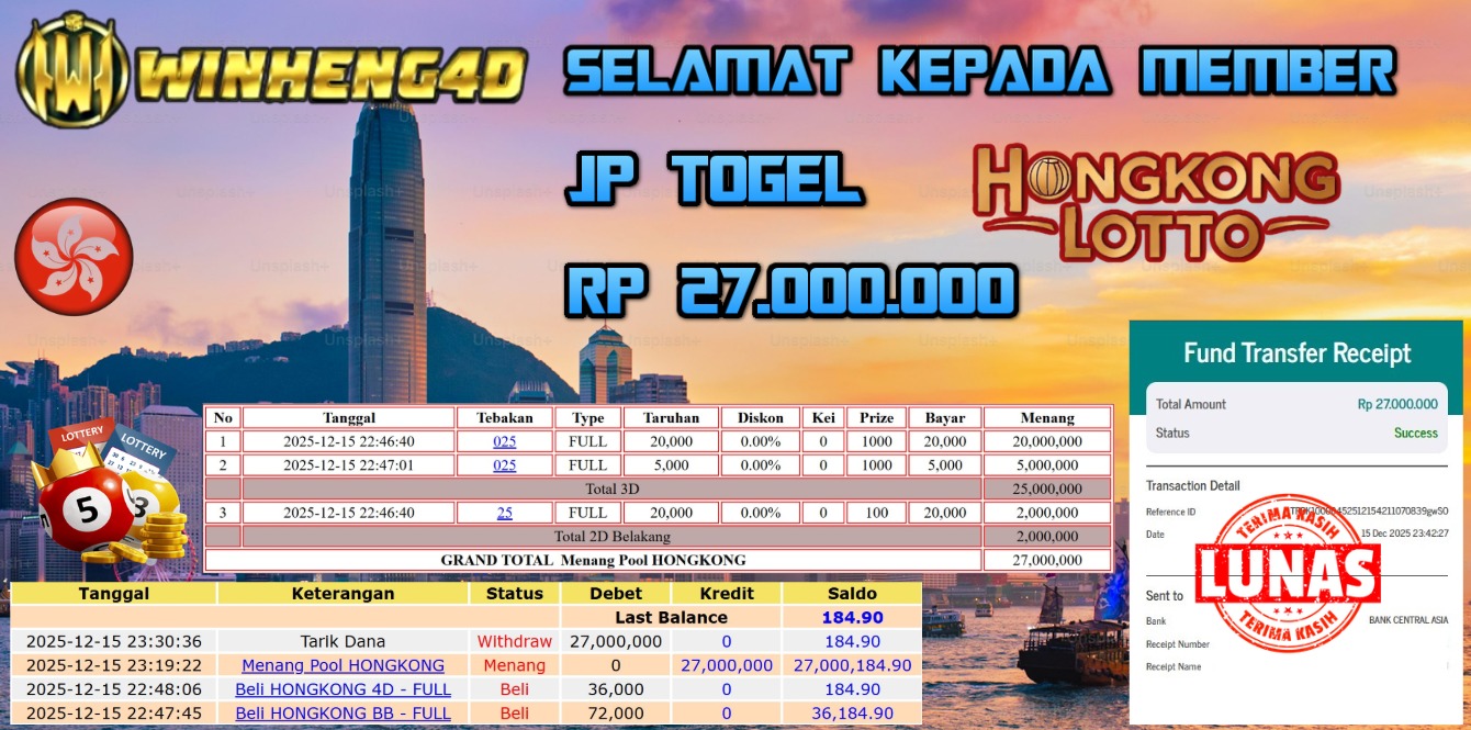 Selamat kepada User ID : JOZZ***55 Telah berhasil mendapatkan kemenangan besar pada Permainan JP TOGEL HONGKONG LOTTO Dengan kemenangan Sebesar Rp 27.000.000,- Setelah mengisi formulir withdraw dengan kurung waktu hanya 5-10 menit pihak WINHENG4D sudah melakukan transfer kepada pemilik User ID dan dana sudah dapat di cairkan oleh pemenang. Bukti pembayaran yang kami berikan merupakan bukti pembayaran yang SAH / VALID yang langung di dapatkan melaui tanda transfer transaksi dari Bank yang di tuju.