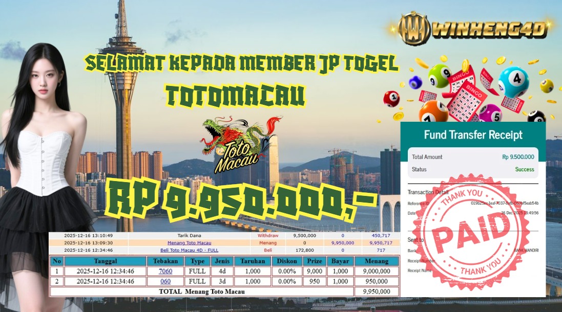 Selamat kepada User ID : FAD***LI Telah berhasil mendapatkan kemenangan besar pada Permainan JP TOGEL TOTOMACAU Dengan kemenangan Sebesar Rp 9.950.000,- Setelah mengisi formulir withdraw dengan kurung waktu hanya 5-10 menit pihak WINHENG4D sudah melakukan transfer kepada pemilik User ID dan dana sudah dapat di cairkan oleh pemenang. Bukti pembayaran yang kami berikan merupakan bukti pembayaran yang SAH / VALID yang langung di dapatkan melaui tanda transfer transaksi dari Bank yang di tuju.