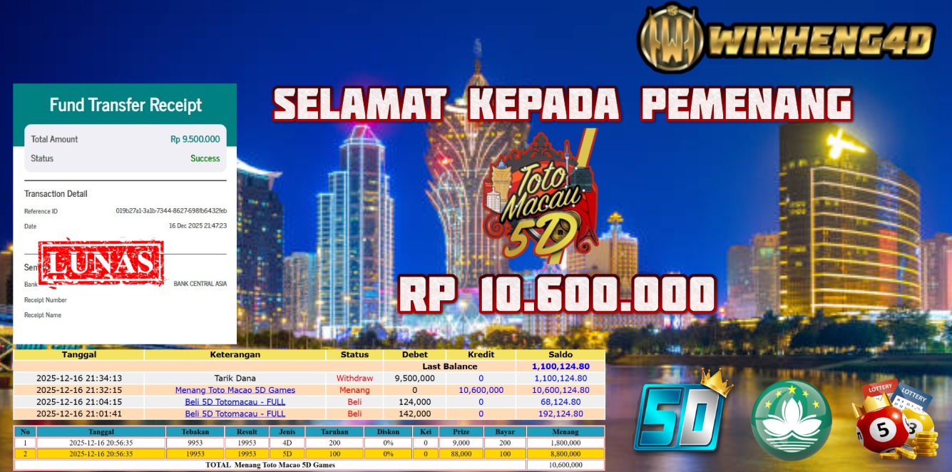 SELAMAT KEPADA MEMBER JP TOGEL TOTO MACAU 5D Rp 10.600.000,- LUNAS