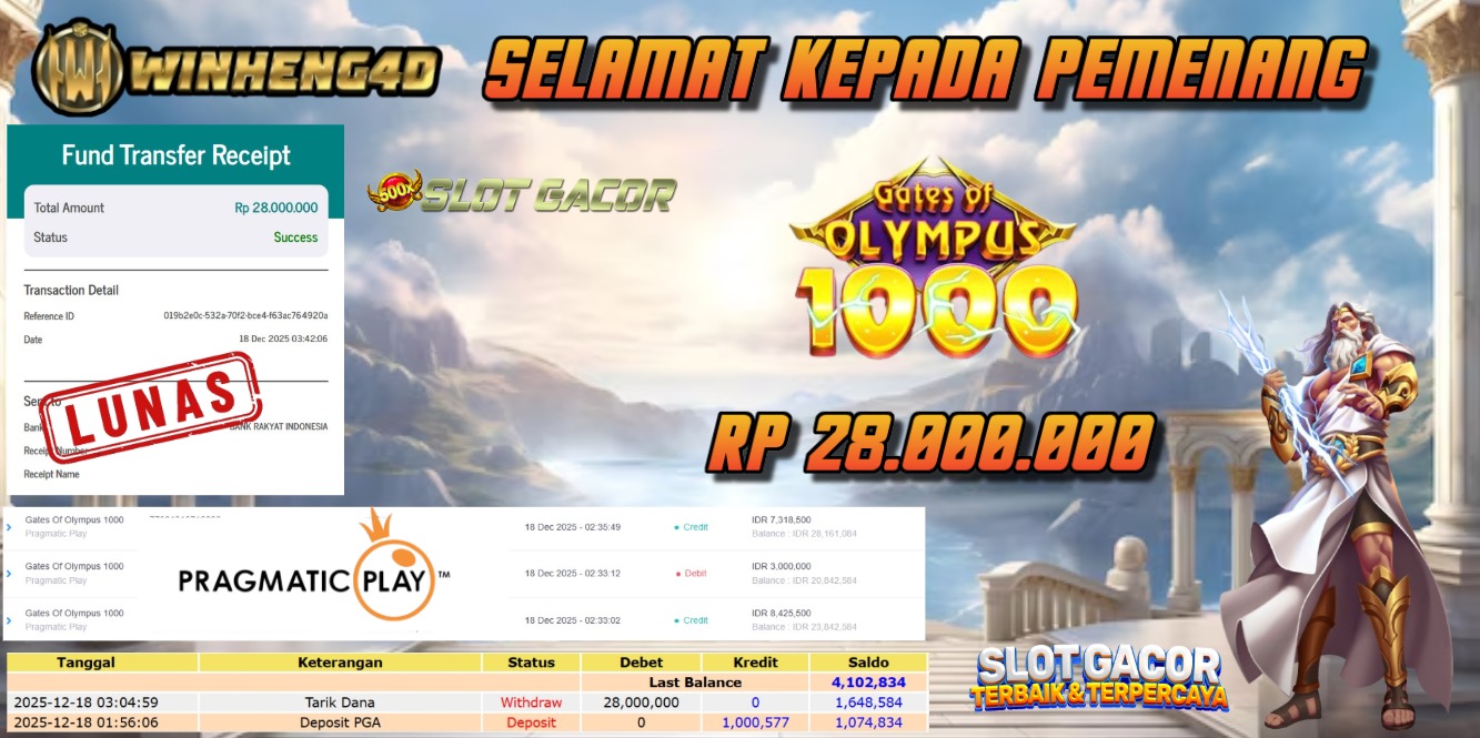 Selamat kepada User ID : TUPO***AA Telah berhasil mendapatkan kemenangan besar pada Permainan JP SLOT GATES OF OLYMPUS 1000 Dengan kemenangan Sebesar Rp 28.000.000,- Setelah mengisi formulir withdraw dengan kurung waktu hanya 5-10 menit pihak WINHENG4D sudah melakukan transfer kepada pemilik User ID dan dana sudah dapat di cairkan oleh pemenang. Bukti pembayaran yang kami berikan merupakan bukti pembayaran yang SAH / VALID yang langung di dapatkan melaui tanda transfer transaksi dari Bank yang di tuju.