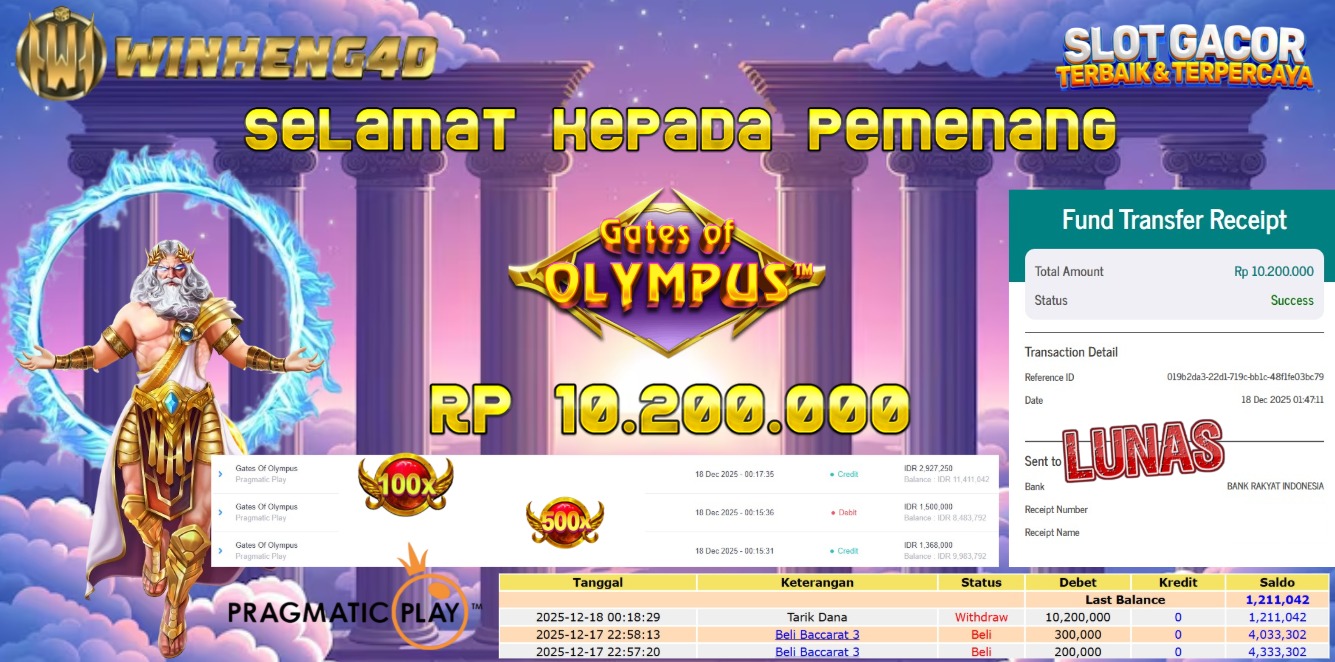 Selamat kepada User ID : BAJD***29 Telah berhasil mendapatkan kemenangan besar pada Permainan JP SLOT GATES OF OLYMPUS Dengan kemenangan Sebesar Rp 10.200.000,- Setelah mengisi formulir withdraw dengan kurung waktu hanya 5-10 menit pihak WINHENG4D sudah melakukan transfer kepada pemilik User ID dan dana sudah dapat di cairkan oleh pemenang. Bukti pembayaran yang kami berikan merupakan bukti pembayaran yang SAH / VALID yang langung di dapatkan melaui tanda transfer transaksi dari Bank yang di tuju.