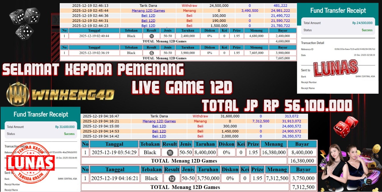 Selamat kepada User ID : STAR***TAN Telah berhasil mendapatkan kemenangan besar pada Permainan JP LIVE GAME 12D Dengan kemenangan Sebesar Rp 56.100.000,- Setelah mengisi formulir withdraw dengan kurung waktu hanya 5-10 menit pihak WINHENG4D sudah melakukan transfer kepada pemilik User ID dan dana sudah dapat di cairkan oleh pemenang. Bukti pembayaran yang kami berikan merupakan bukti pembayaran yang SAH / VALID yang langung di dapatkan melaui tanda transfer transaksi dari Bank yang di tuju.