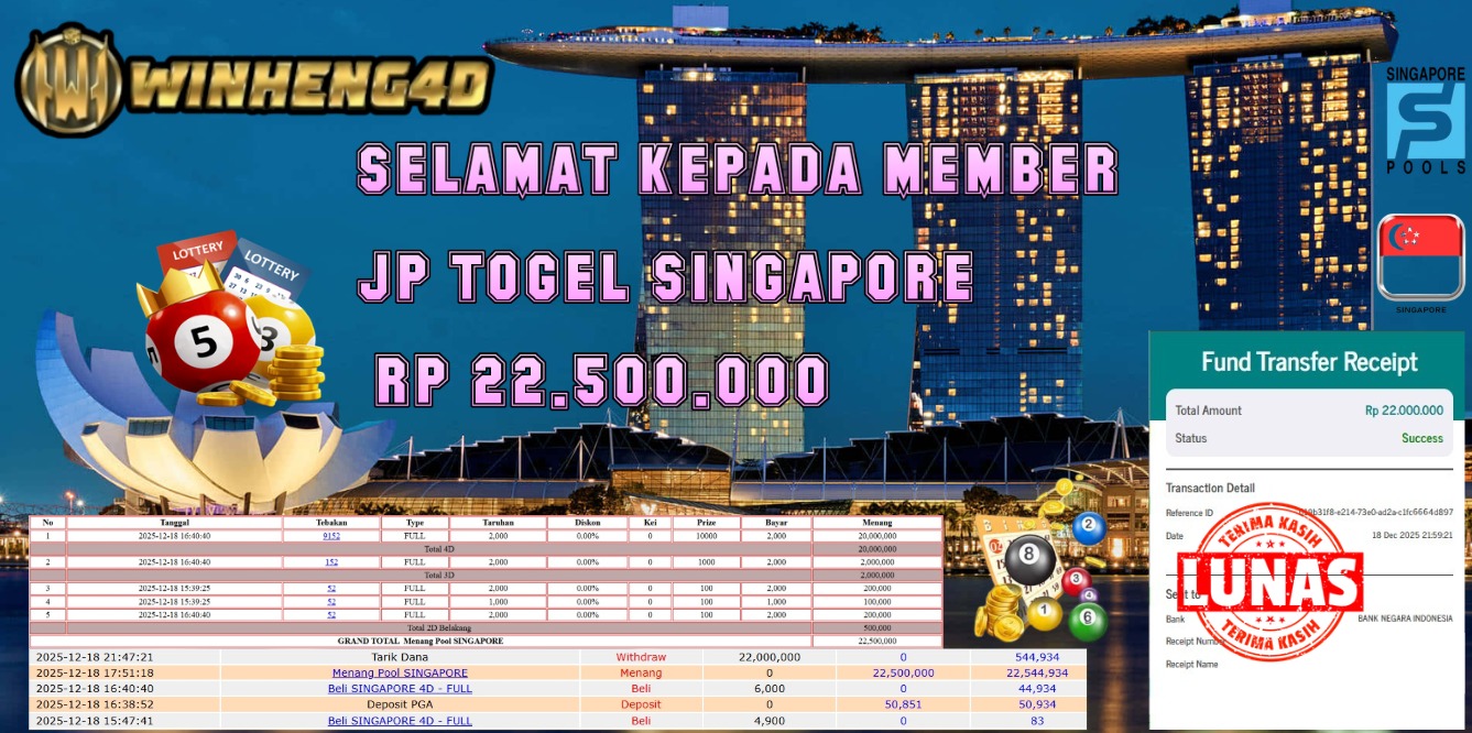 Selamat kepada User ID : BILL***L9 Telah berhasil mendapatkan kemenangan besar pada Permainan JP TOGEL SINGAPORE Dengan kemenangan Sebesar Rp 22.500.000,- Setelah mengisi formulir withdraw dengan kurung waktu hanya 5-10 menit pihak WINHENG4D sudah melakukan transfer kepada pemilik User ID dan dana sudah dapat di cairkan oleh pemenang. Bukti pembayaran yang kami berikan merupakan bukti pembayaran yang SAH / VALID yang langung di dapatkan melaui tanda transfer transaksi dari Bank yang di tuju.