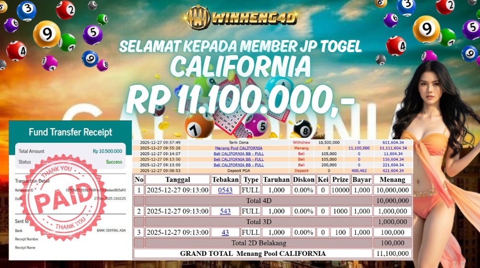 Selamat kepada User ID : BER***KO Telah berhasil mendapatkan kemenangan besar pada Permainan JP TOGEL CALIFORNIA Dengan kemenangan Sebesar Rp … Baca selengkapnya...
