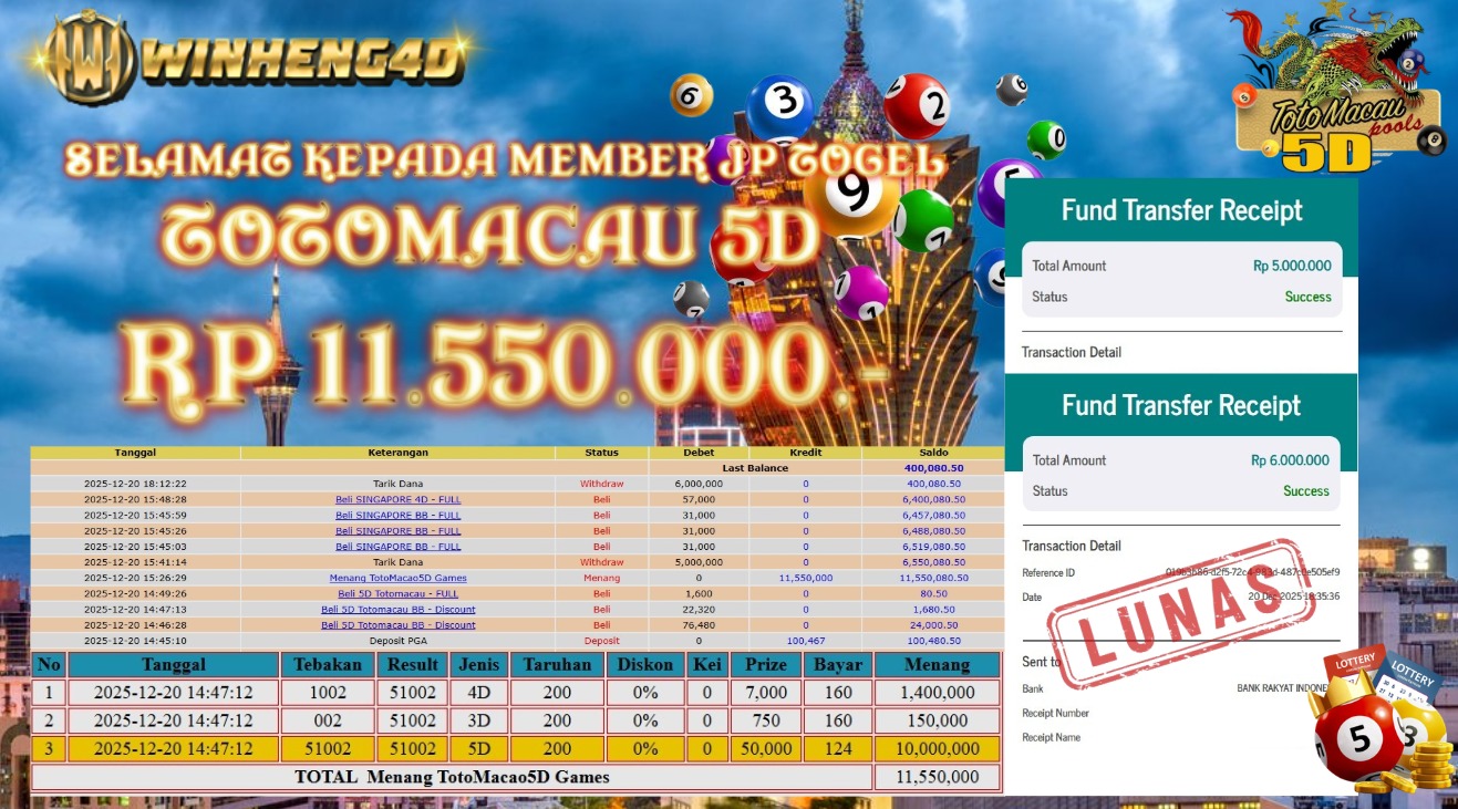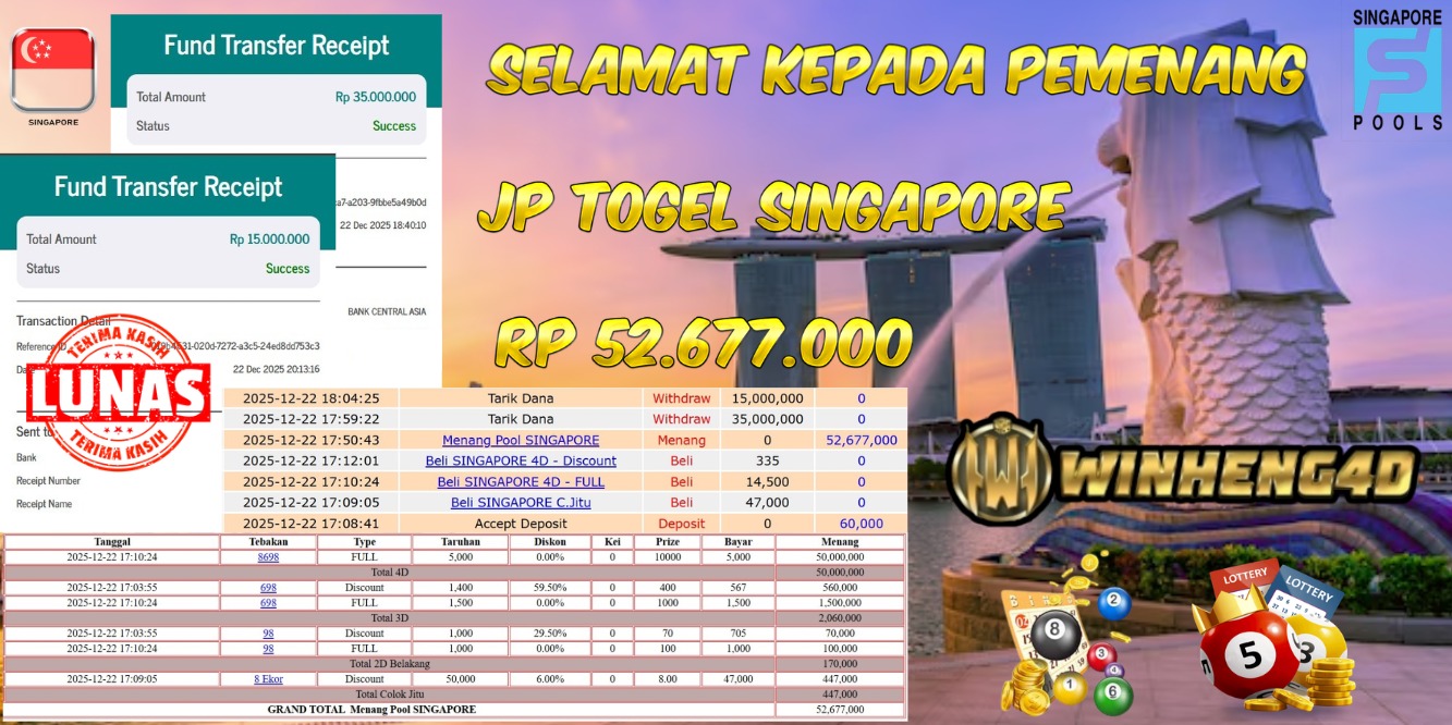 SELAMAT KEPADA MEMBER JP TOGEL SINGAPORE Rp 52.677.000,- LUNAS