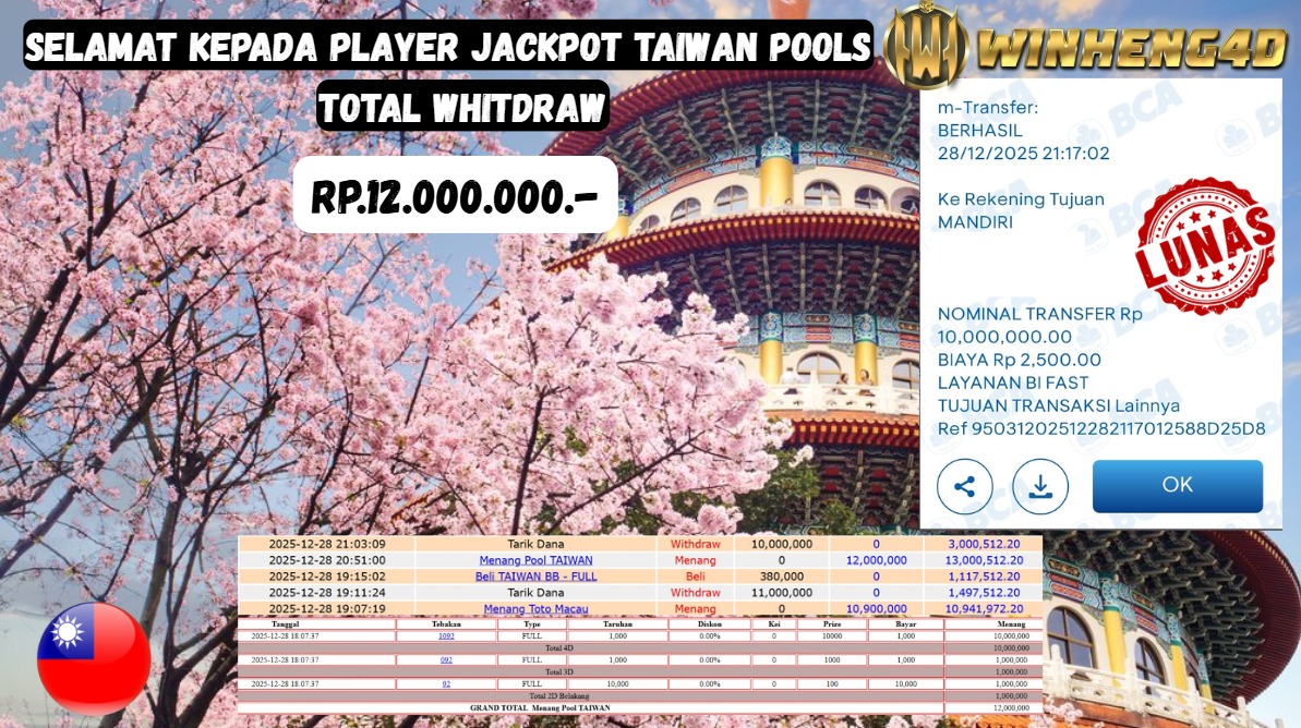 Selamat kepada User ID : HAR***KI Telah berhasil mendapatkan kemenangan besar pada Permainan JP LIVE GAMES 12D Dengan kemenangan Sebesar … Baca selengkapnya...