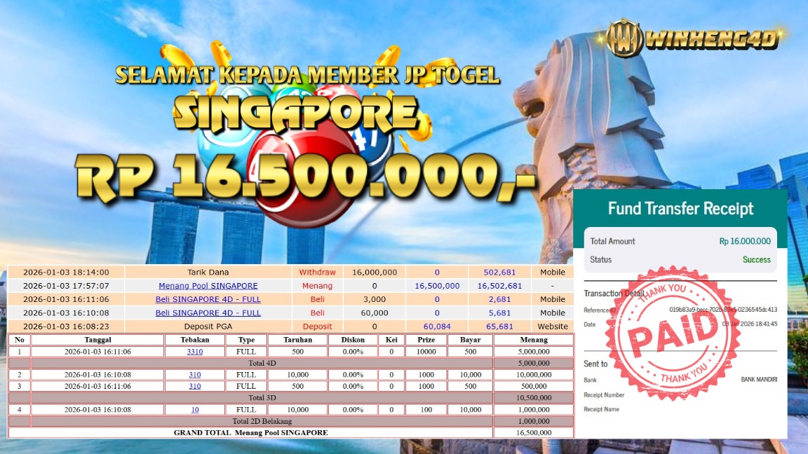 Selamat kepada User ID : QOY***88 Telah berhasil mendapatkan kemenangan besar pada Permainan JP TOGEL SINGAPORE Dengan kemenangan Sebesar Rp 16.500.000,- Setelah mengisi formulir withdraw dengan kurung waktu hanya 5-10 menit pihak WINHENG4D sudah melakukan transfer kepada pemilik User ID dan dana sudah dapat di cairkan oleh pemenang. Bukti pembayaran yang kami berikan merupakan bukti pembayaran yang SAH / VALID yang langung di dapatkan melaui tanda transfer transaksi dari Bank yang di tuju.