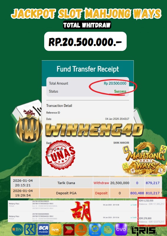 Selamat kepada User ID : TAR***N Telah berhasil mendapatkan kemenangan besar pada Permainan JP SLOT MAHJONG WAYS Dengan kemenangan Sebesar Rp 20.500.000,- Setelah mengisi formulir withdraw dengan kurung waktu hanya 5-10 menit pihak WINHENG4D sudah melakukan transfer kepada pemilik User ID dan dana sudah dapat di cairkan oleh pemenang. Bukti pembayaran yang kami berikan merupakan bukti pembayaran yang SAH / VALID yang langung di dapatkan melaui tanda transfer transaksi dari Bank yang di tuju.