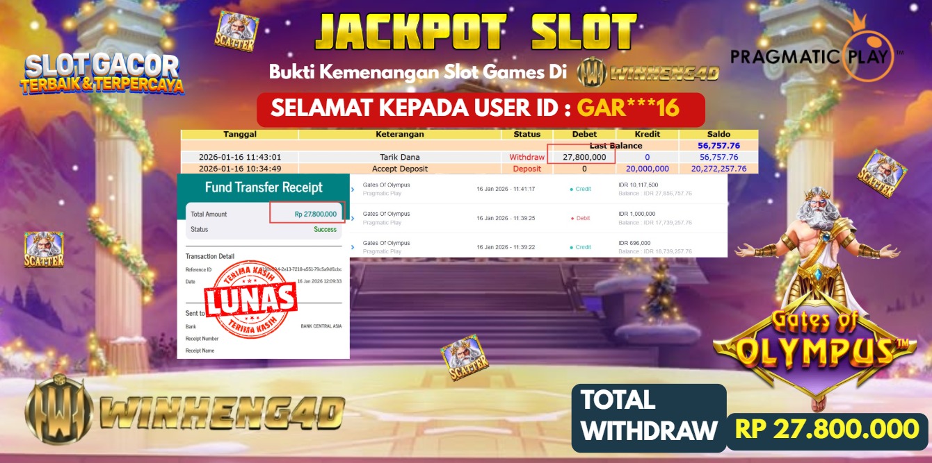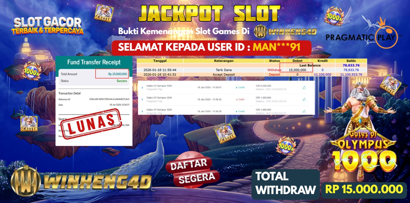 Selamat kepada User ID : MAN***91 Telah berhasil mendapatkan kemenangan besar pada Permainan JP SLOT GATES OF OLYMPUS 1000 Dengan … Baca selengkapnya...