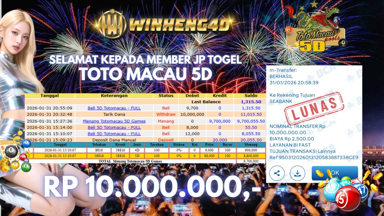 Selamat kepada User ID : BER***F Telah berhasil mendapatkan kemenangan besar pada Permainan JP TOGEL TOTO MACAU 5D Dengan kemenangan … Baca selengkapnya...