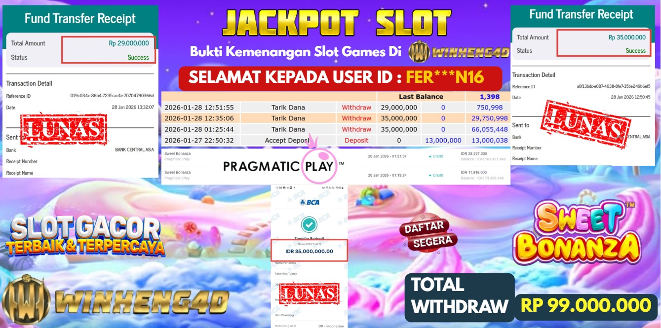 Selamat kepada User ID : FER***N16 Telah berhasil mendapatkan kemenangan besar pada Permainan JP SLOT SWEET BONANZA Dengan kemenangan Sebesar … Baca selengkapnya...